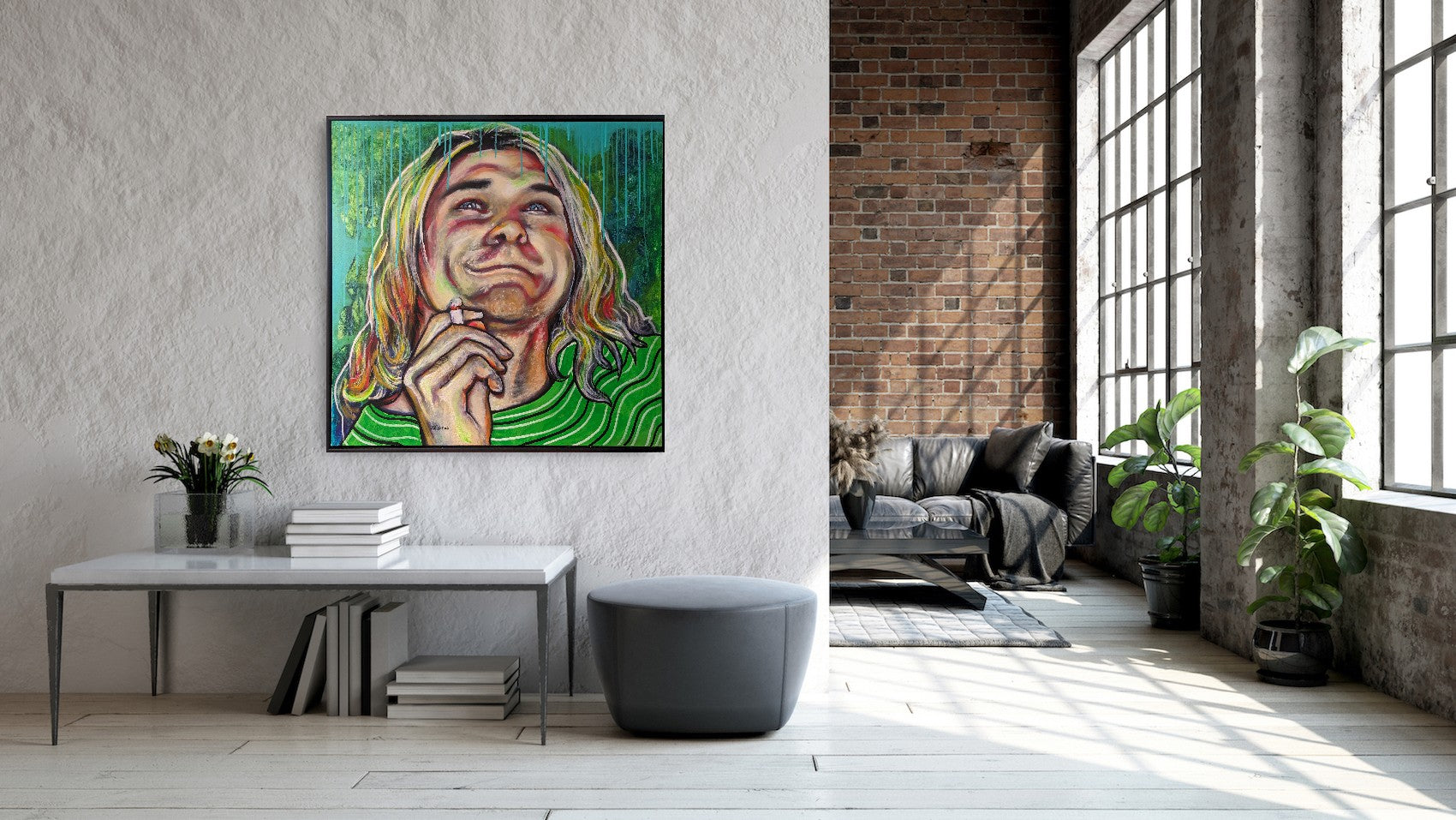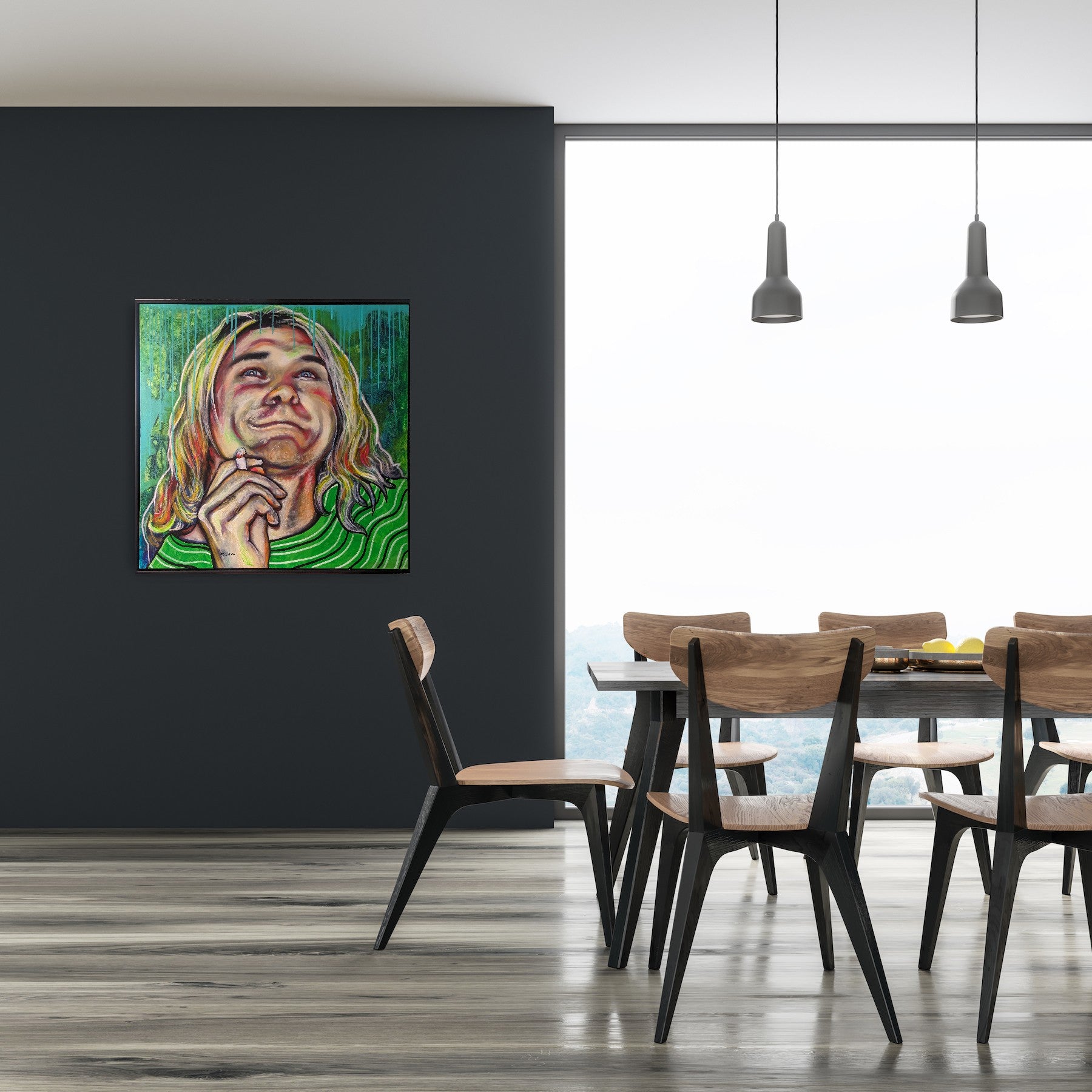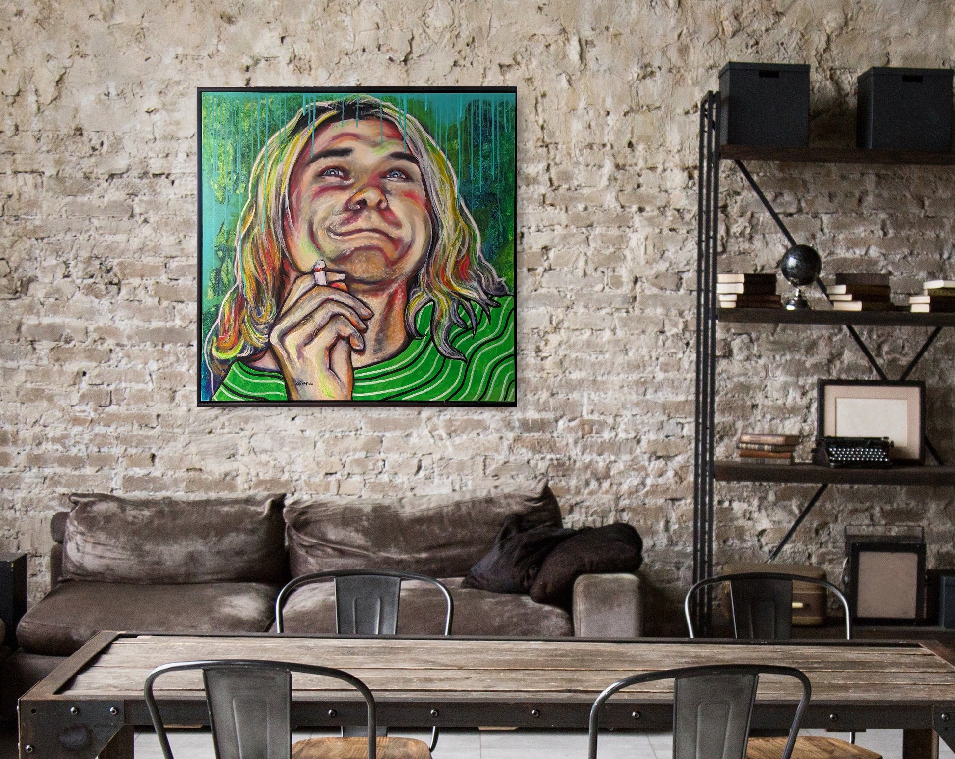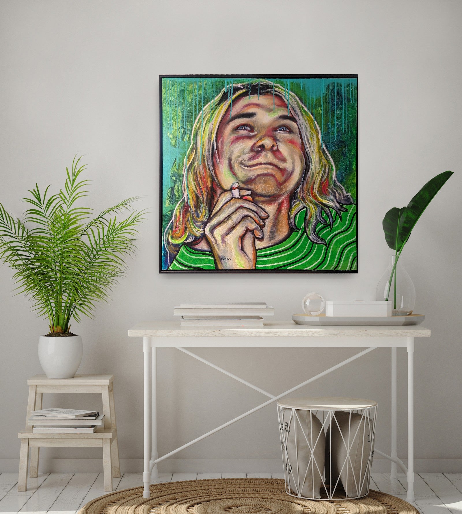Measuring 90cm x 90cm, this piece commands attention with its dynamic composition and chaotic imagery. Crafted using acrylic paint, ink, and Posca markers on premium cotton canvas, every brushstroke captures the essence of Cobain's tumultuous journey and his raw intensity.