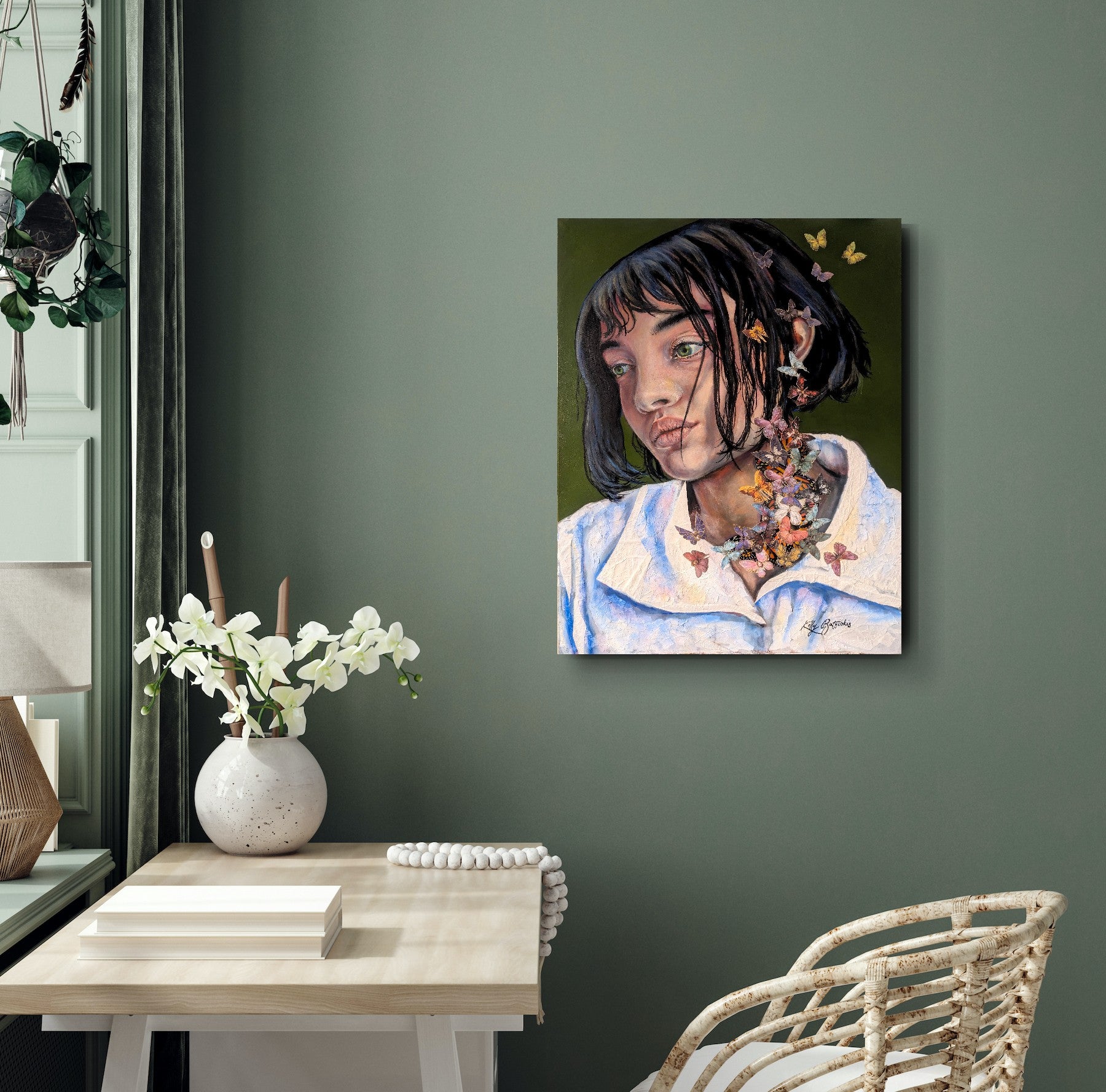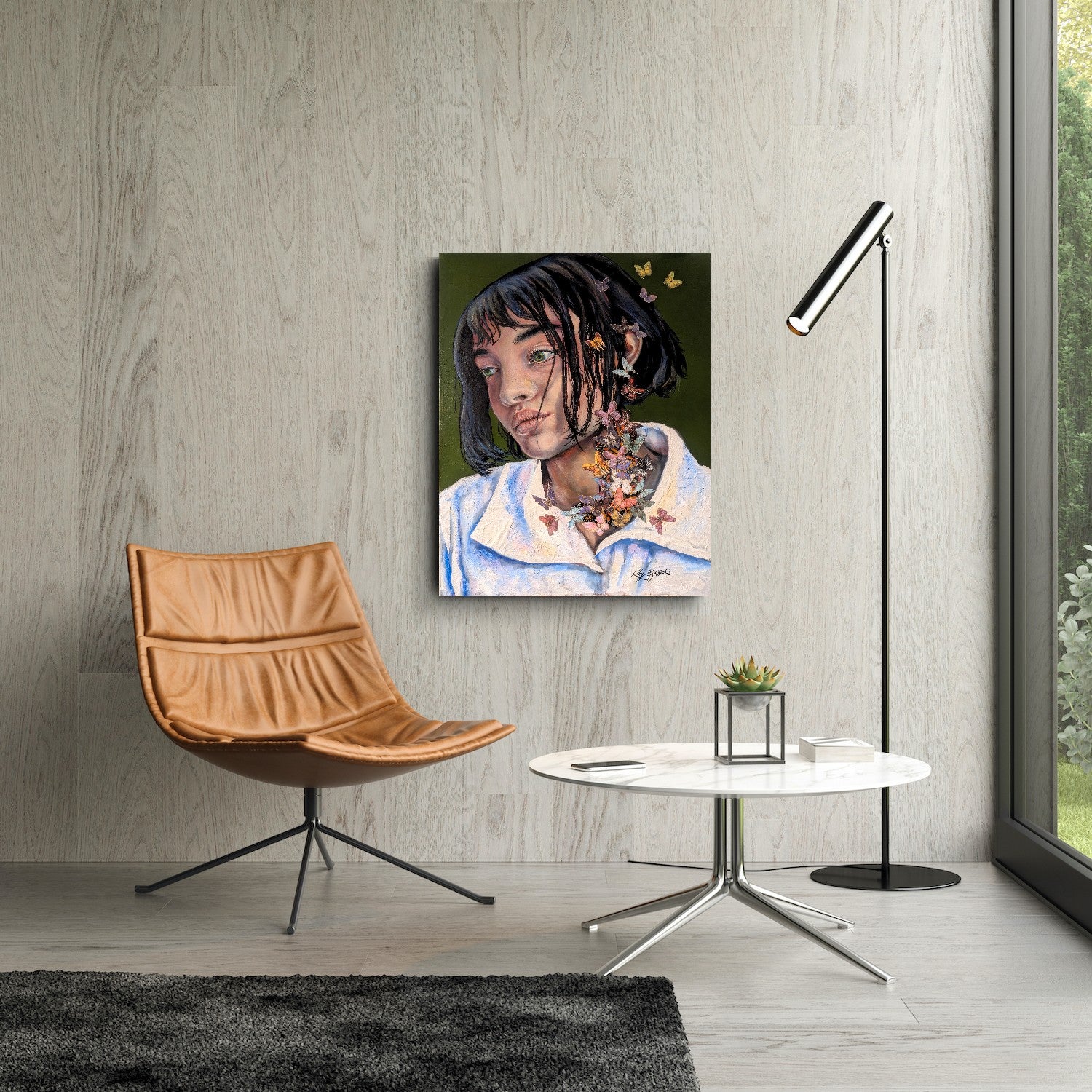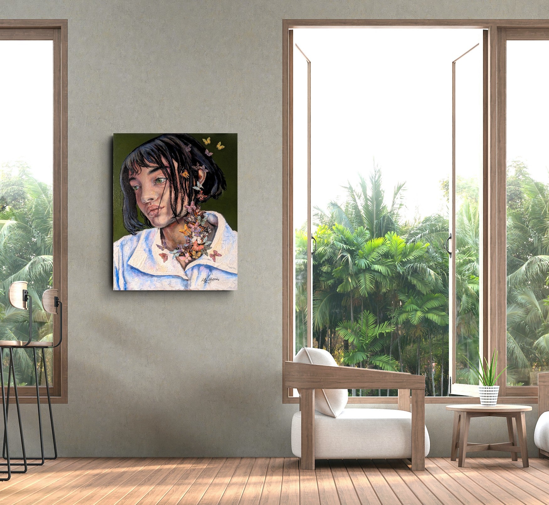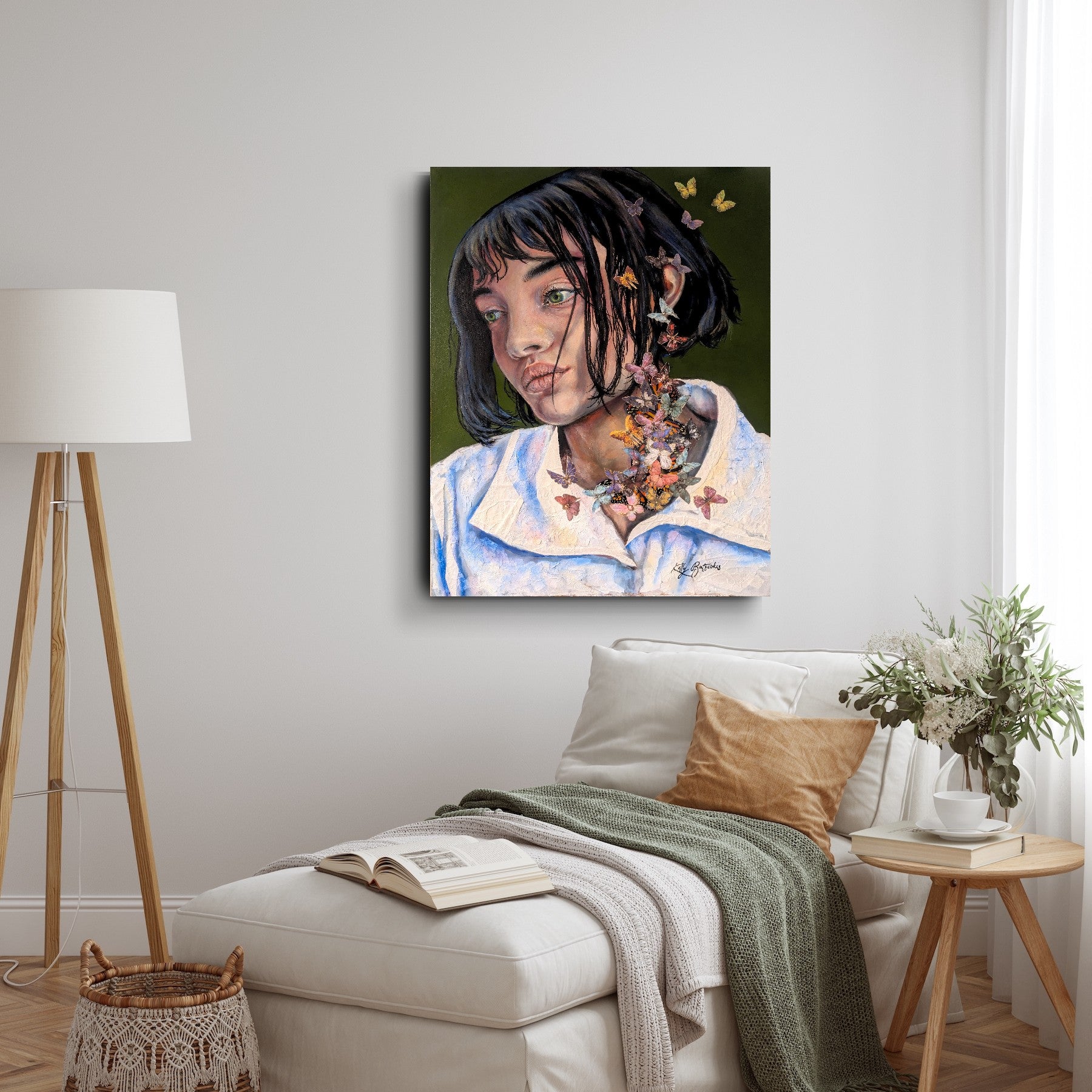 This is an original mixed-media collage painting (acrylic, posca, crepe paper and vintage butterfly print paper), 76cm x 102cm x 3.8cm, framed in a blackwood float frame and is ready to hang.