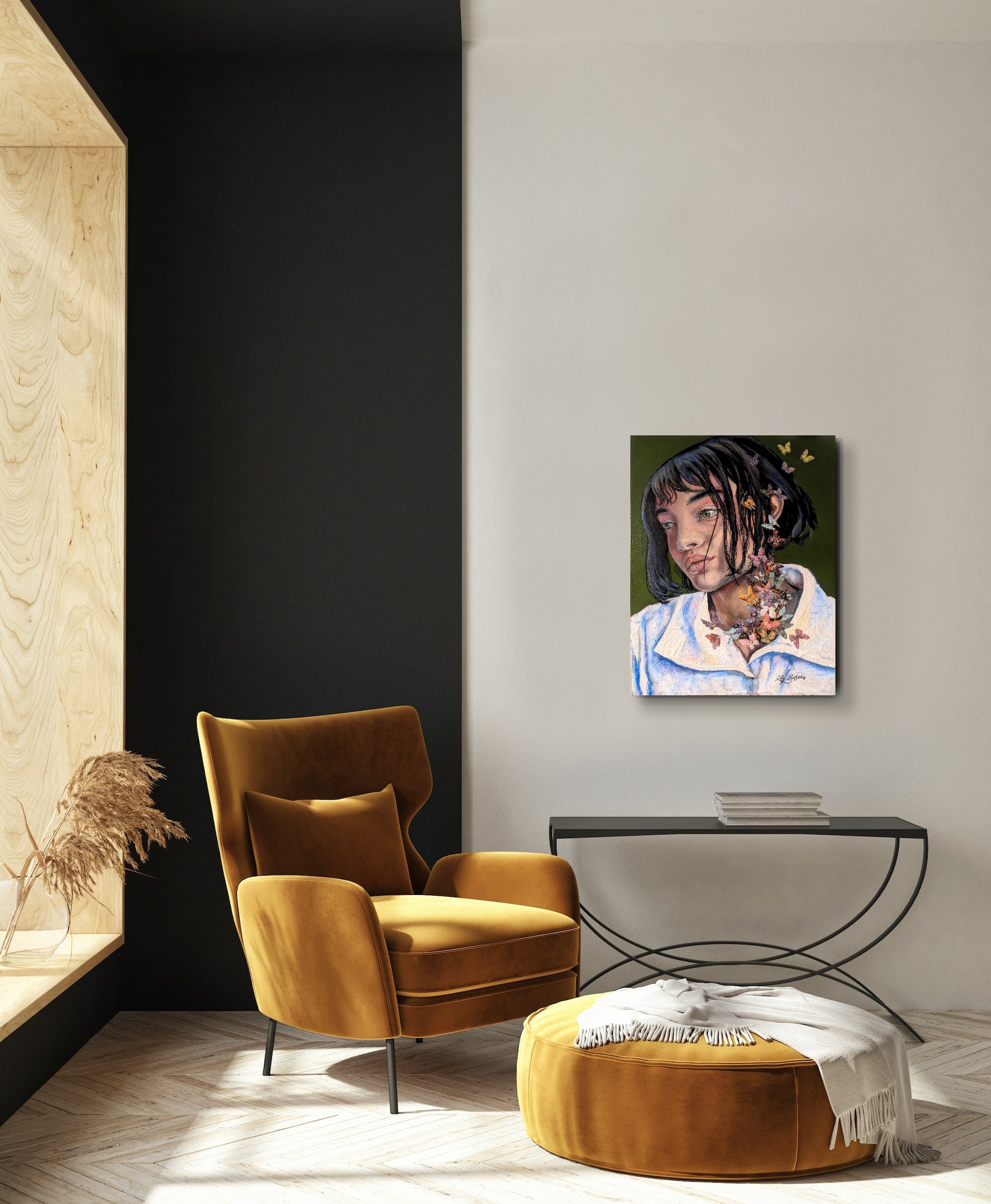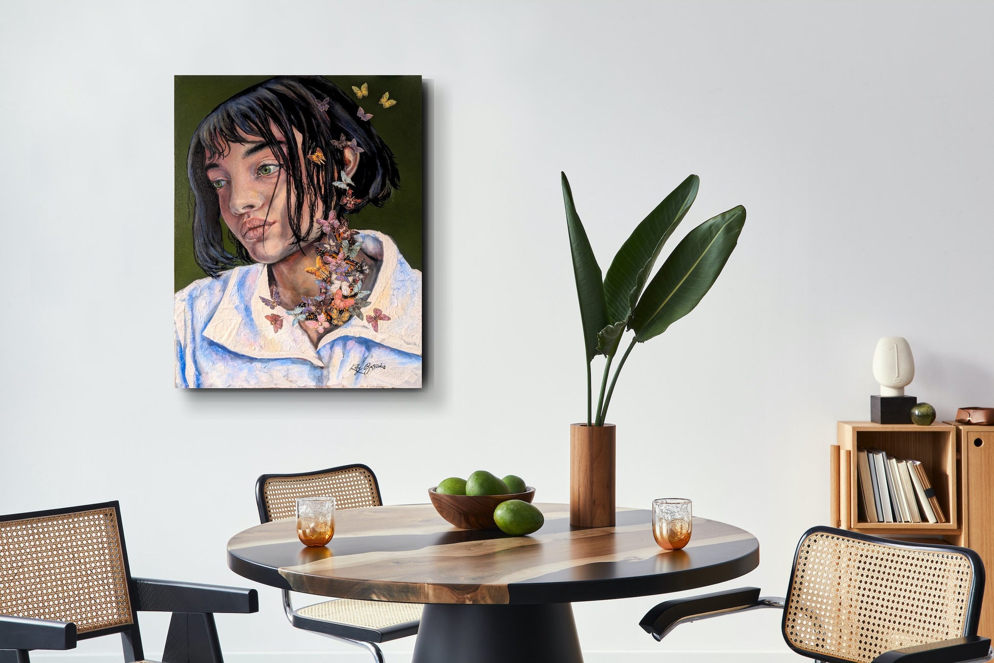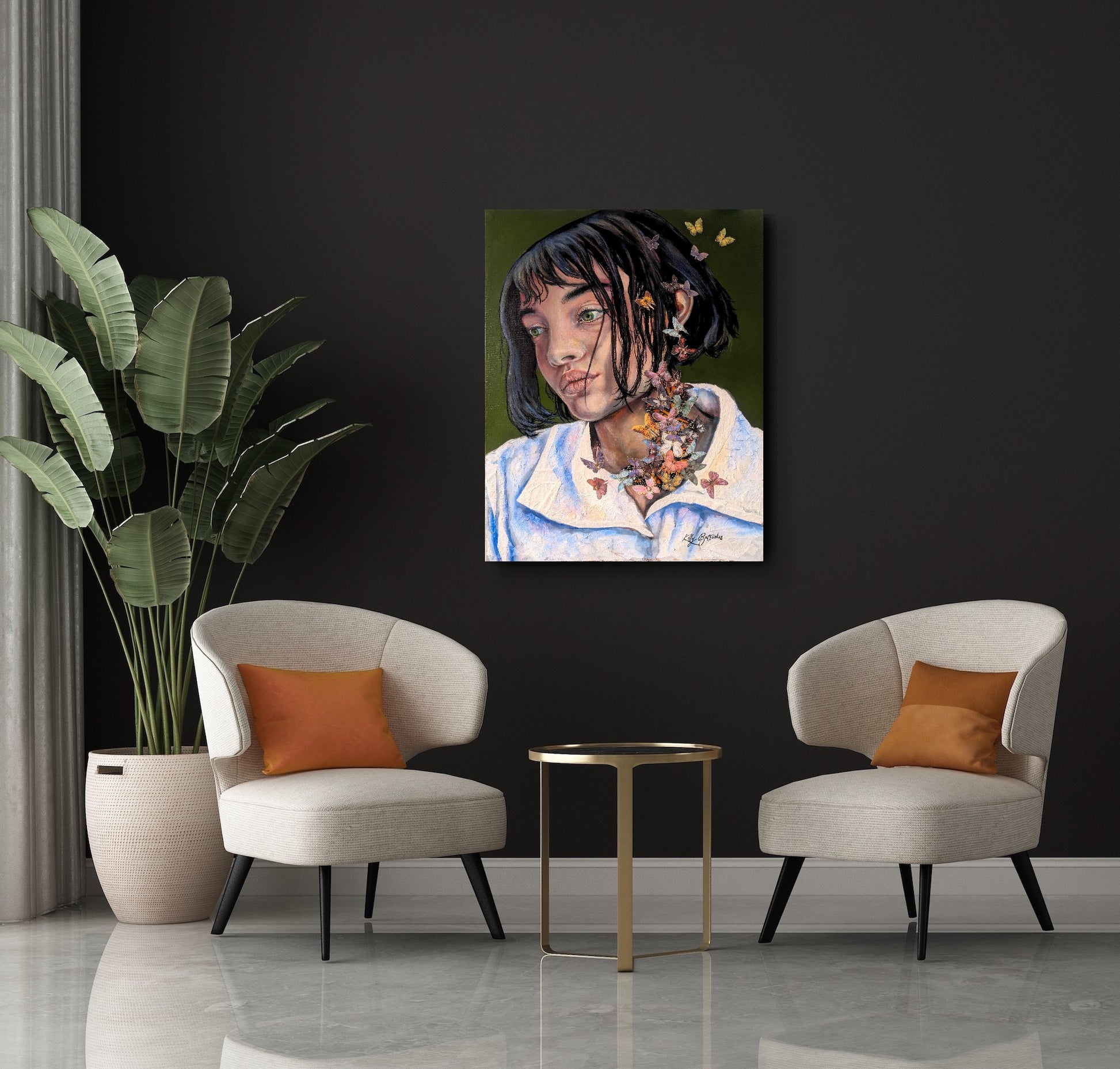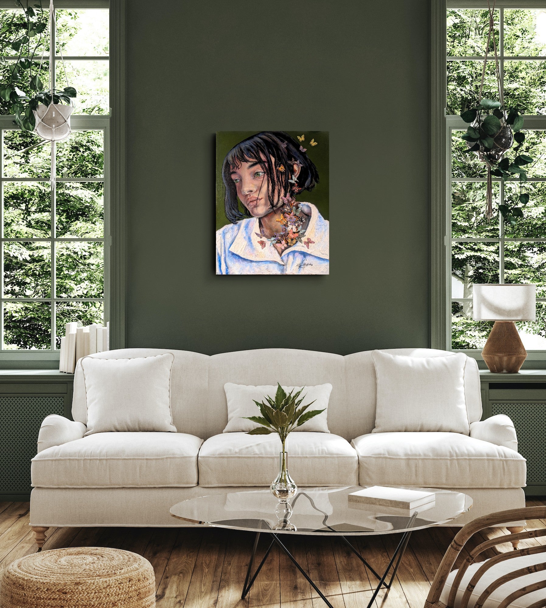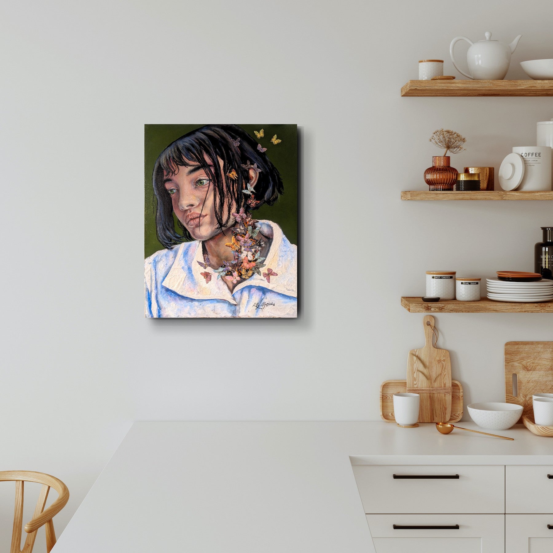 This is an original mixed-media collage painting (acrylic, posca, crepe paper and vintage butterfly print paper), 76cm x 102cm x 3.8cm, framed in a blackwood float frame and is ready to hang.