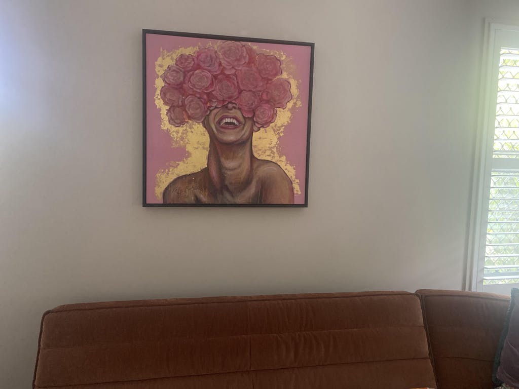 This was my first art purchase and I was really drawn to Kelly’s work. It was so different to anything I had seen before. Rosey connected to me, her vibrant pinks and gold- my favourite colors and that smile. She makes me so happy every time I look at her and I’m so glad I bought her home.