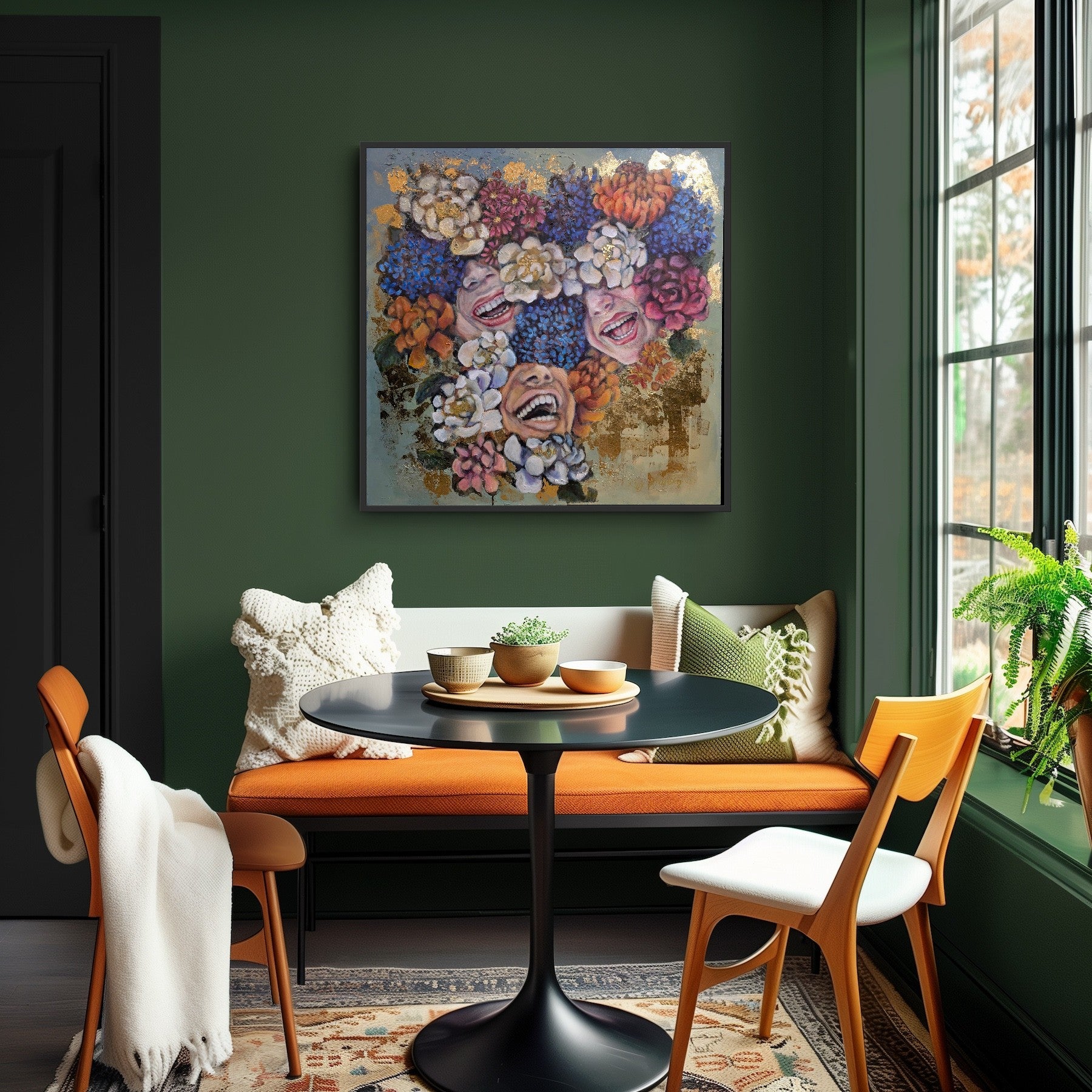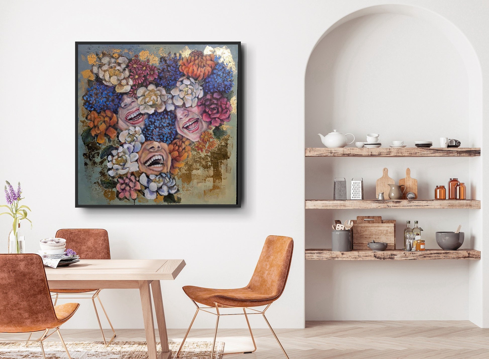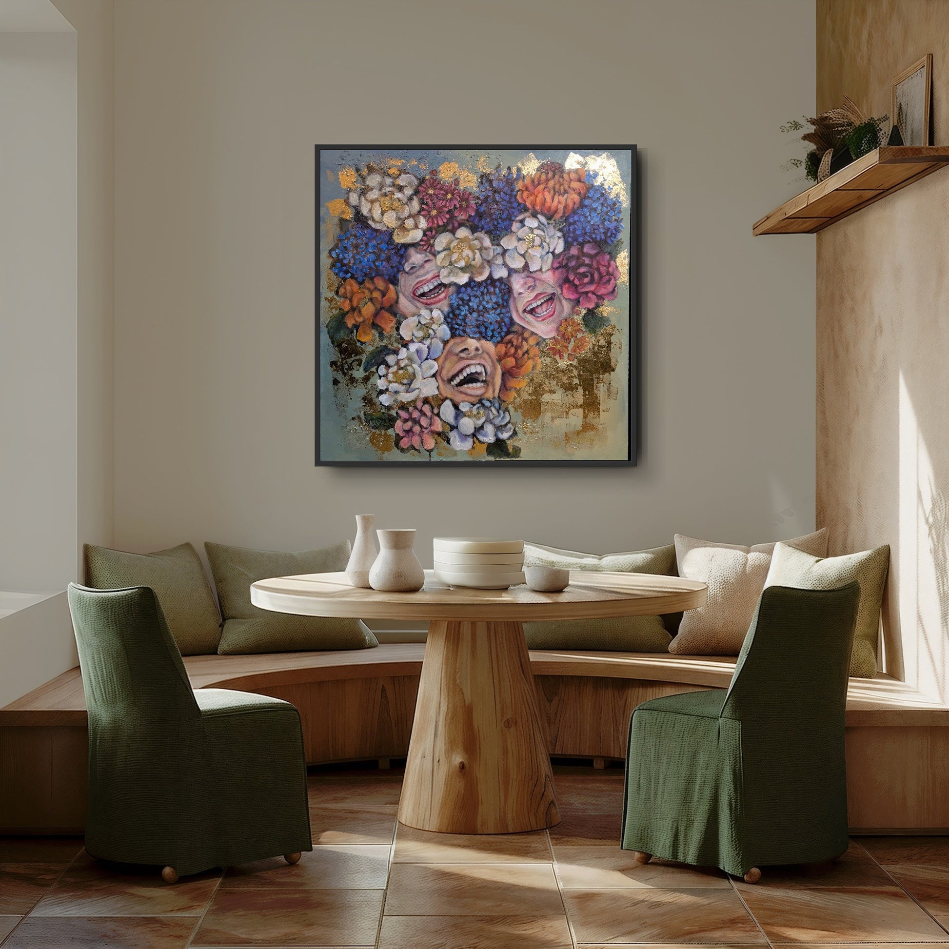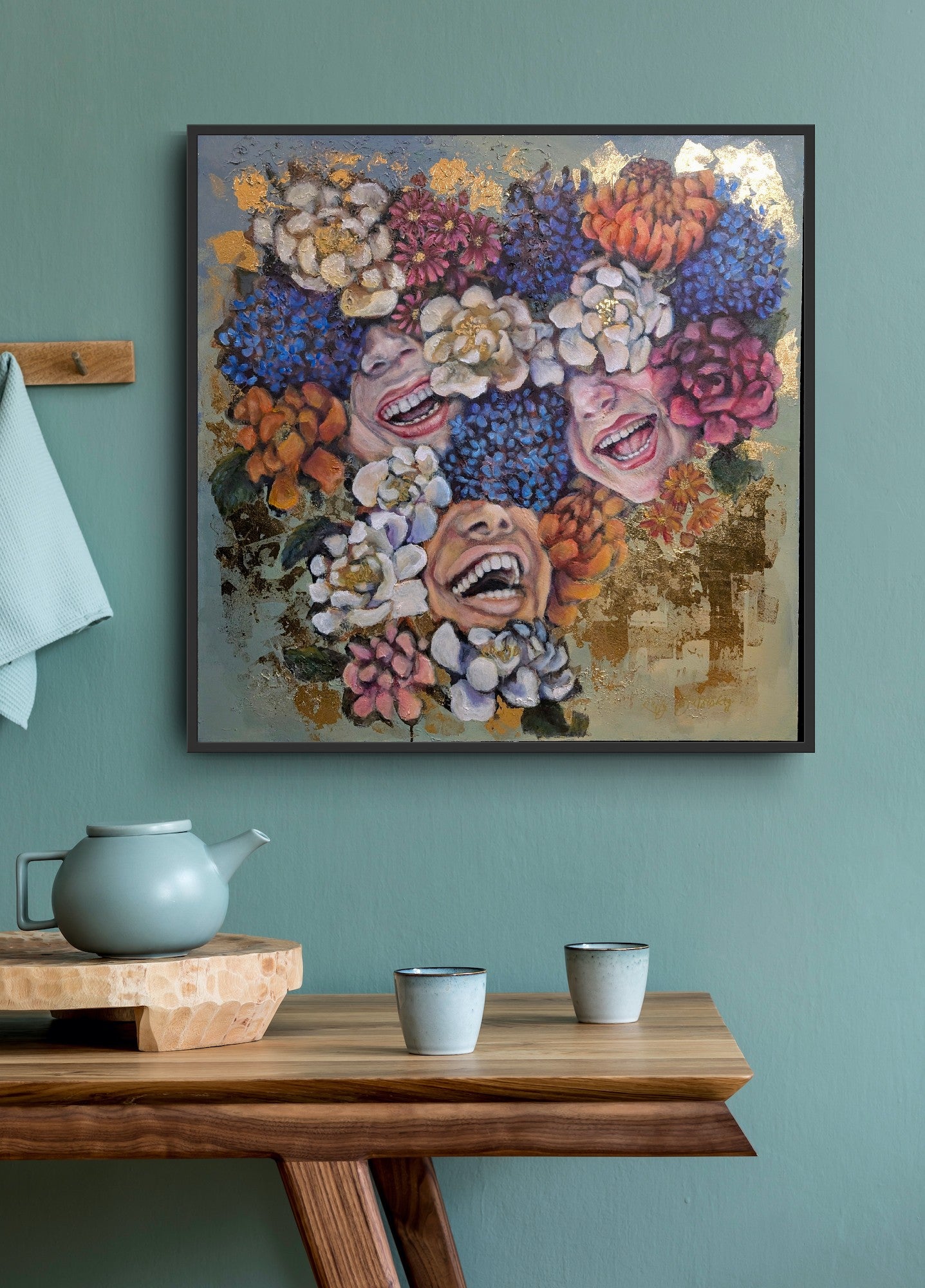 Framed in black pine, this 100cm x 100cm statement piece holds space for joy — not as something fragile, but as something deeply rooted. It honours the moments where joy rises unplanned, when we laugh without restraint, when we bloom without asking permission.