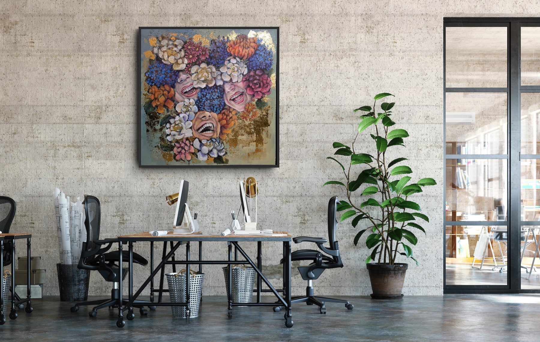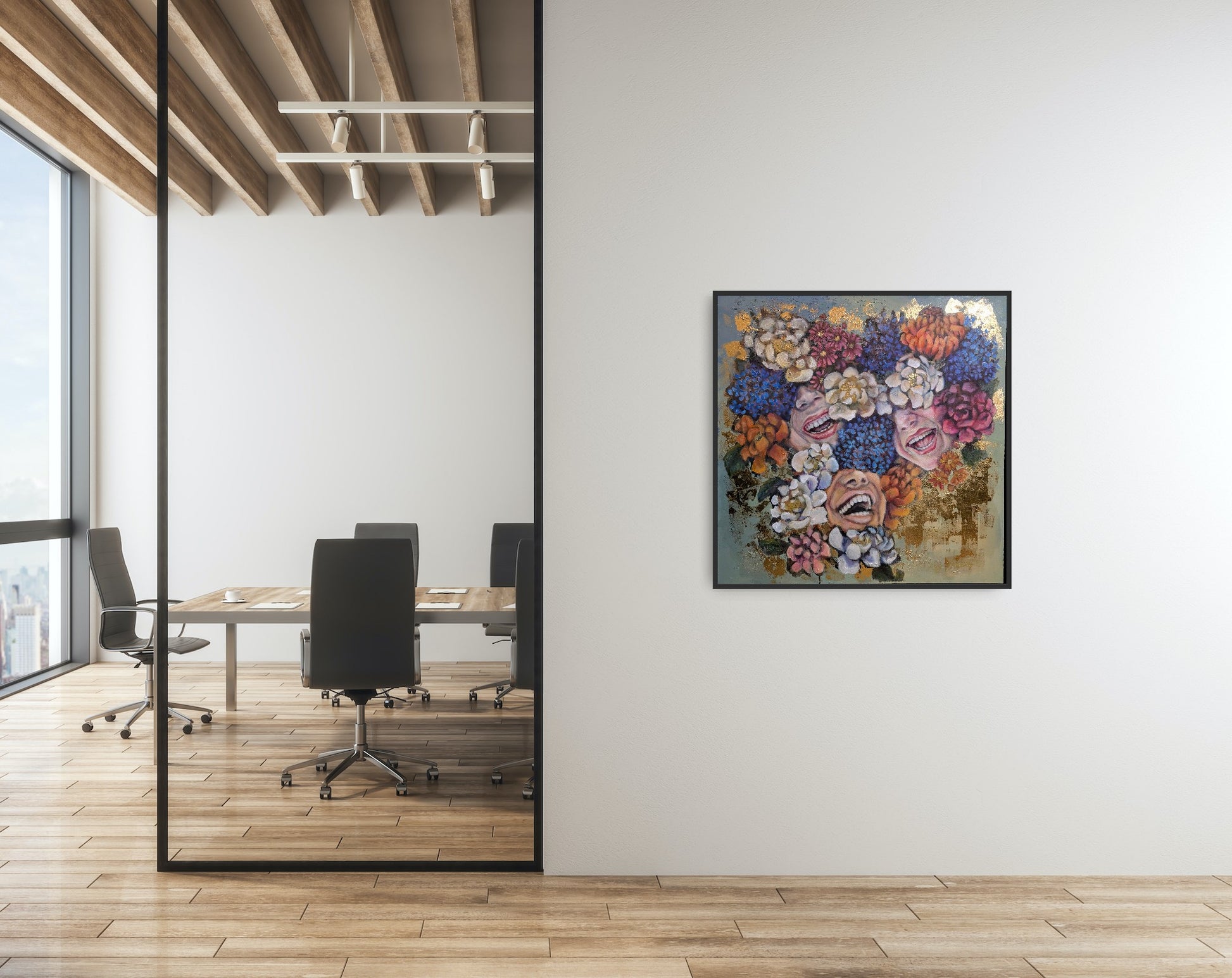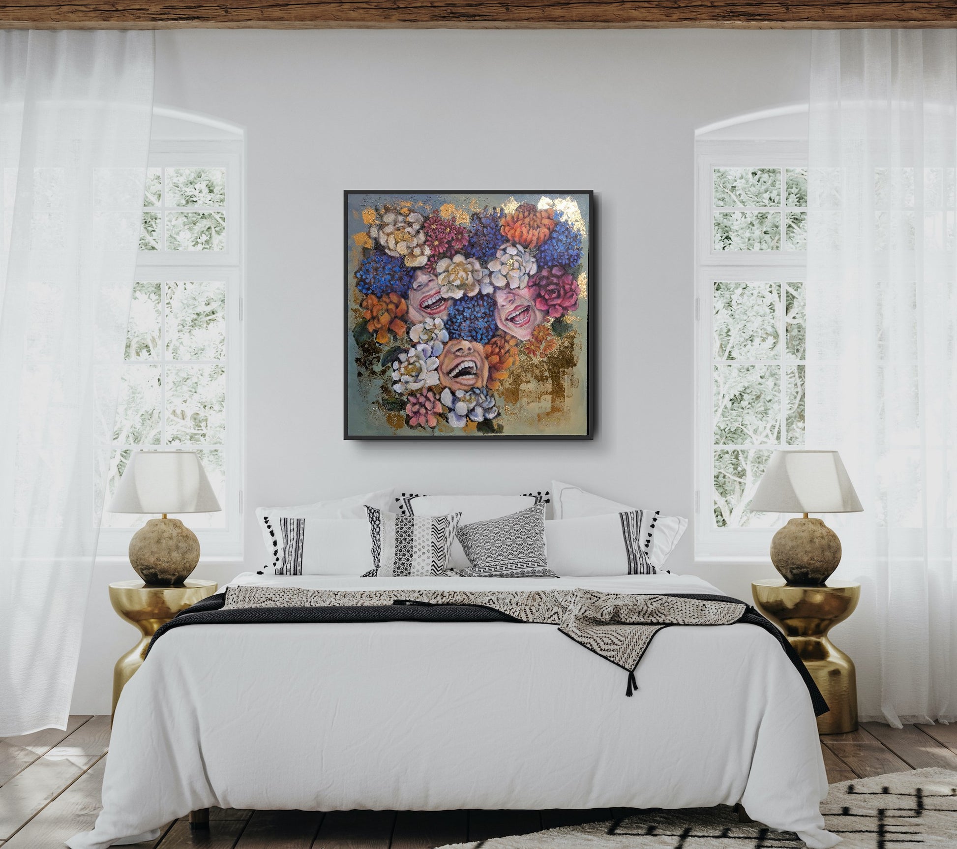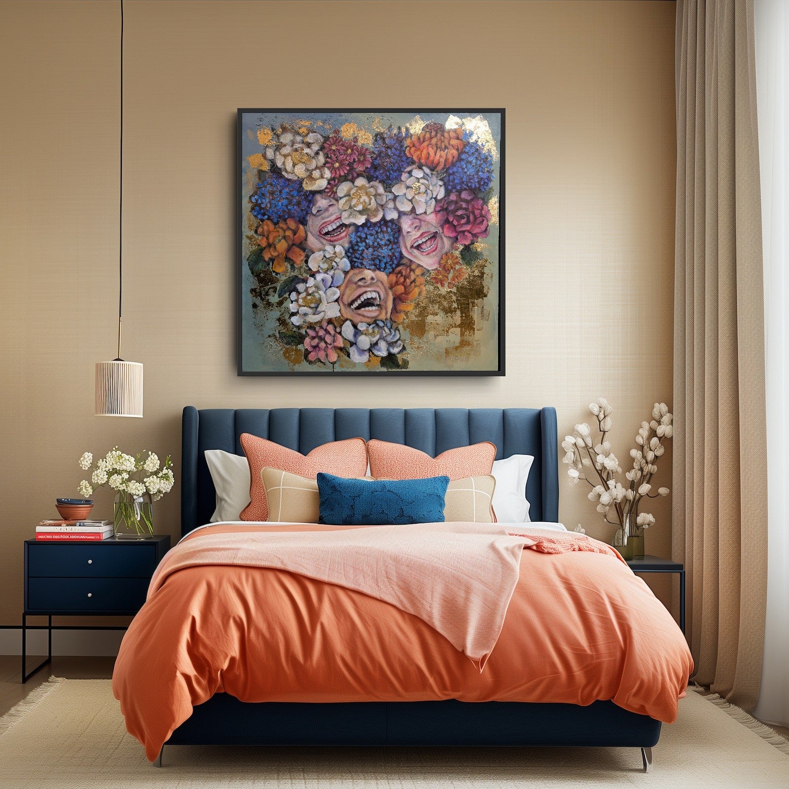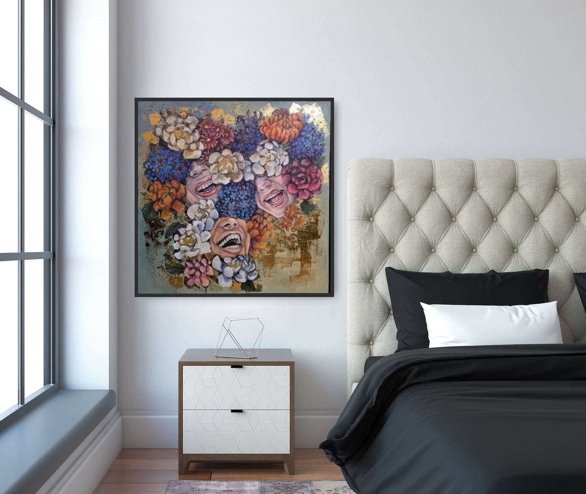 Framed in black pine, this 100cm x 100cm statement piece holds space for joy — not as something fragile, but as something deeply rooted. It honours the moments where joy rises unplanned, when we laugh without restraint, when we bloom without asking permission.