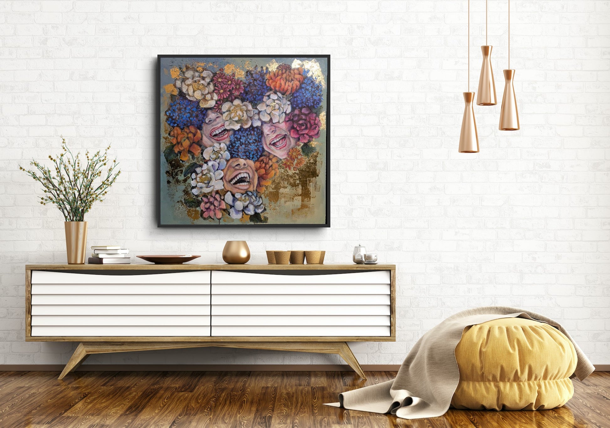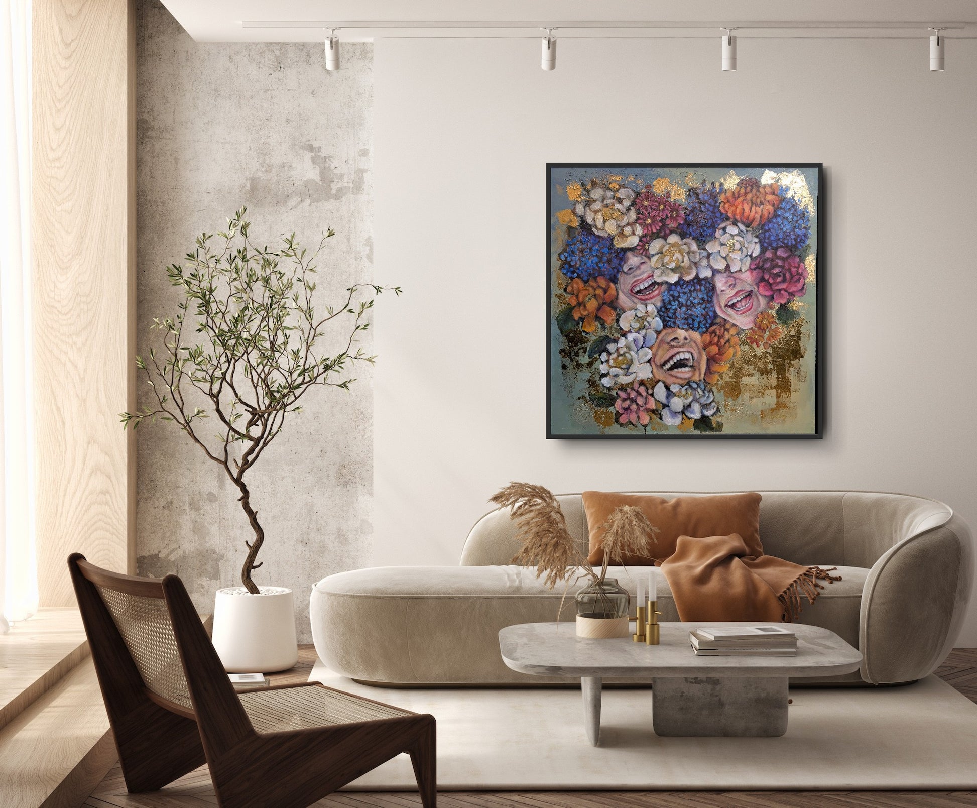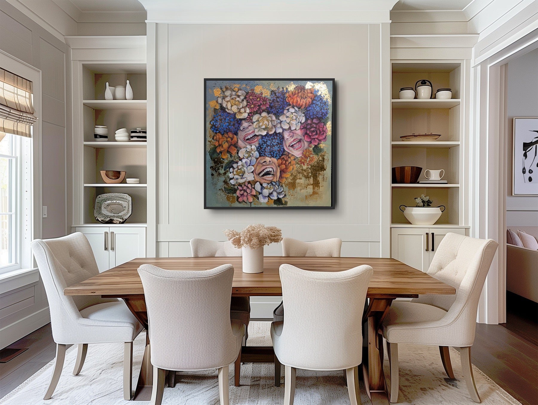 Where Joy Grows is a radiant celebration of shared laughter, blooming emotion, and the quiet power of connection. Three women’s faces emerge from a rich floral tapestry, each caught mid-laugh — unguarded, glowing, and alive.